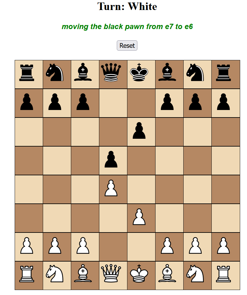 <h2 style="text-align:center">Turn: Black</h2><h3 id="msg" style="color:green">moving the white pawn from d2 to d4</h3><button onclick="location.href='/reset'" style="display:block; margin: 20px auto;">Reset</button>