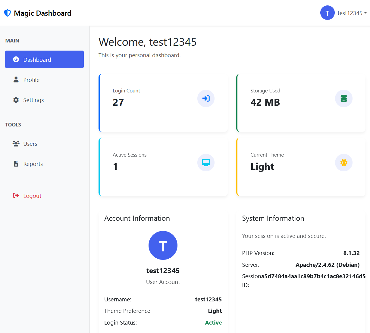 We register to the attached website, and are redirected to a “Magic Dashboard” which more or less only allows users to switch between Light Mode and Dark Mode.