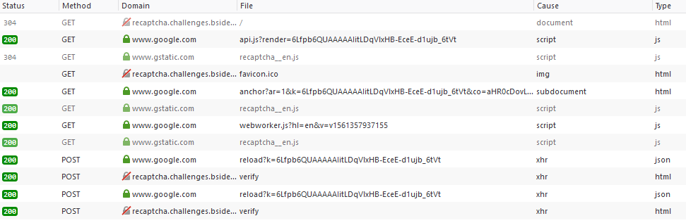 Diving into the requests and responses, we can see that a token received from anchor is being passed again during reload, and some data from reload gets sent in verify (which belongs to the actual website and isn’t part of the ReCaptcha service).