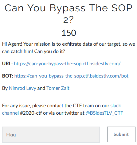 root@kali:/media/sf_CTFs/bsidestlv/SOP# curl 'https://can-you-bypass-the-sop.ctf.bsidestlv.com/bot' \