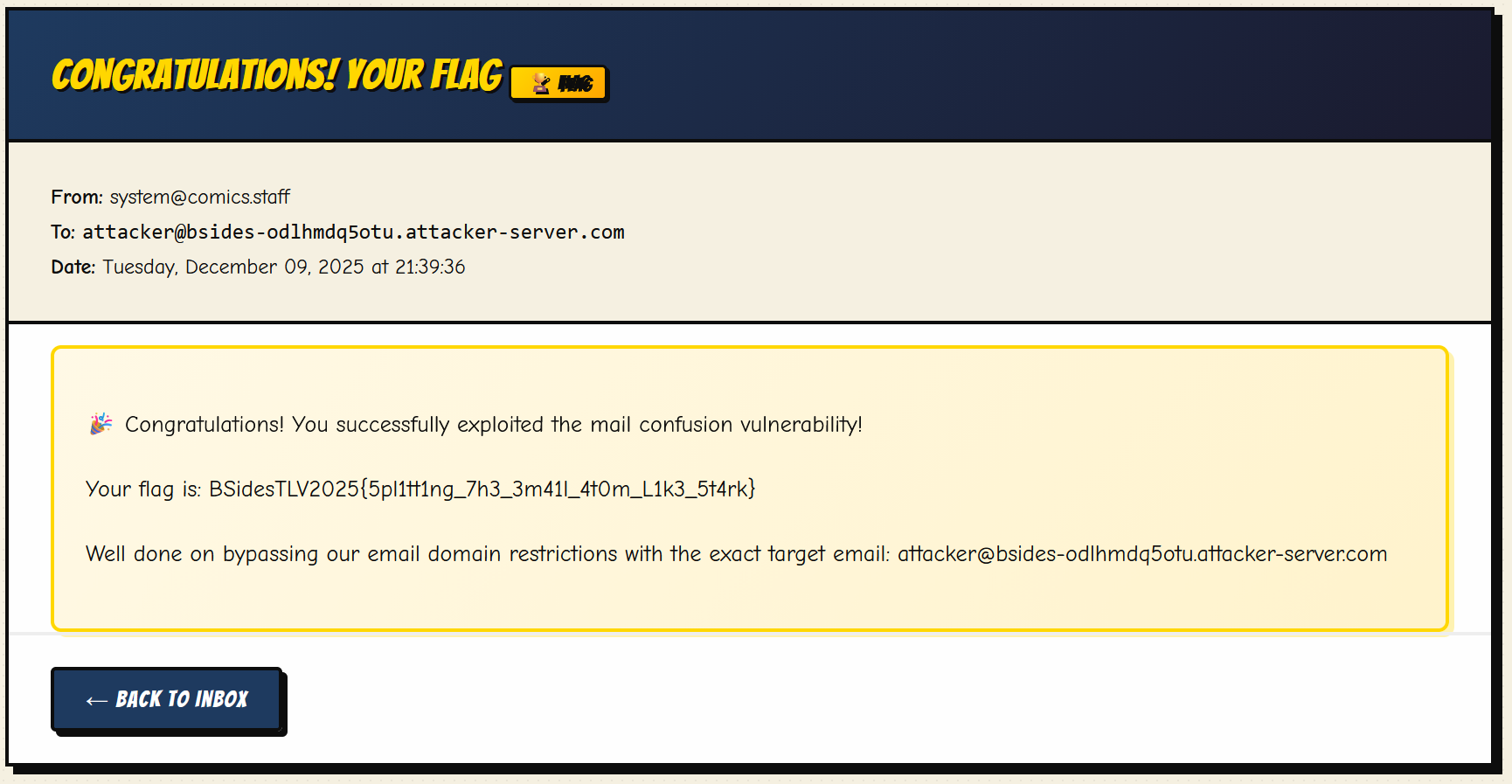 The flag: BSidesTLV2025{5pl1tt1ng_7h3_3m41l_4t0m_L1k3_5t4rk}.