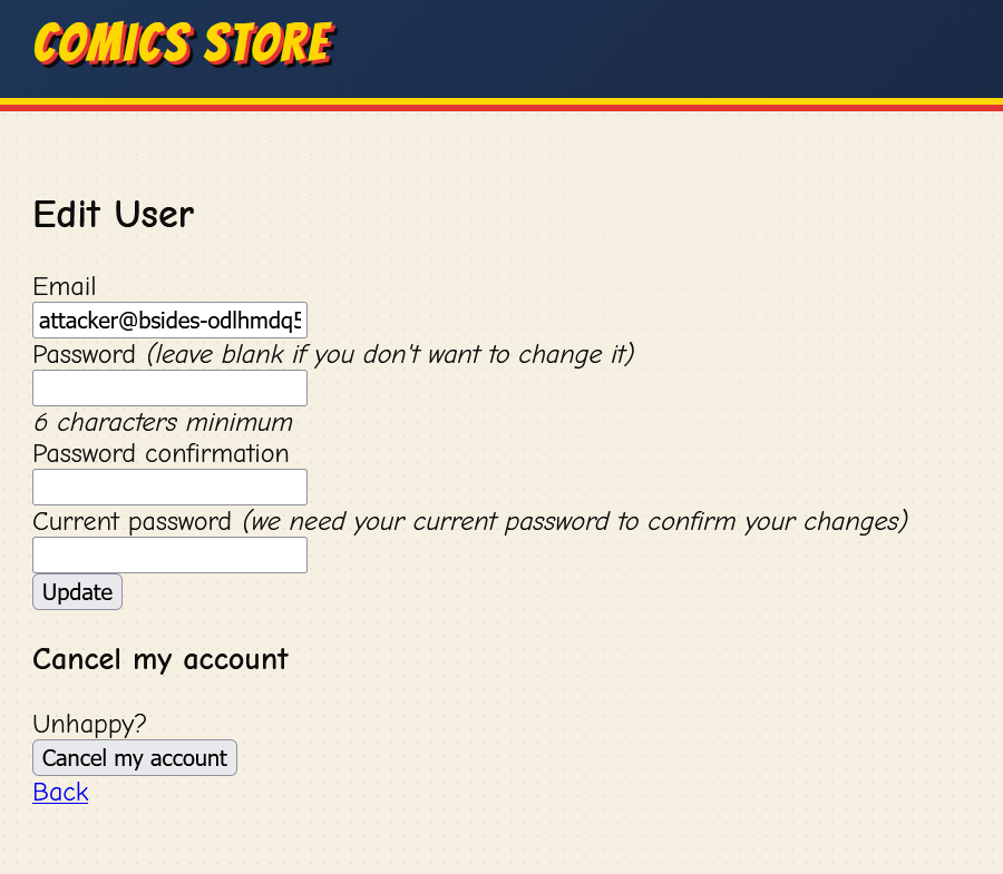 We found a hidden API at /users/edit which allowed changing the user’s email or password,