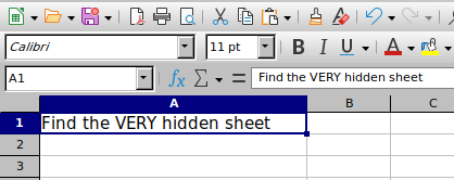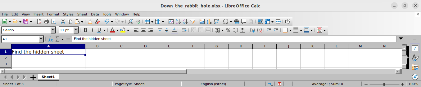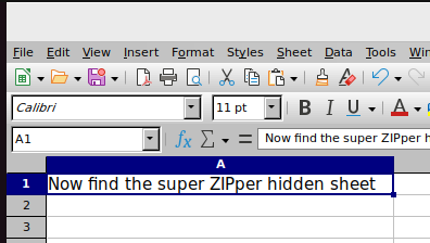 Let’s start by inspecting the Excel Workbook. If we open it with a dedicated program, we get one sheet named “Sheet1” saying “Find the hidden sheet”.