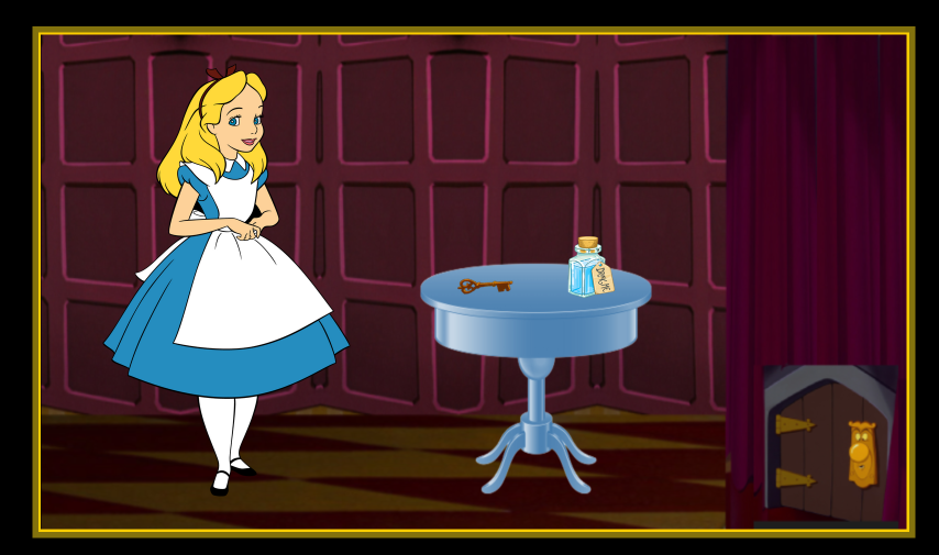 We visit the attached website and are greeted with a simple interactive game starring Alice from Wonderland. On the table next to here are a key and a potion labeled “Drink Me”.